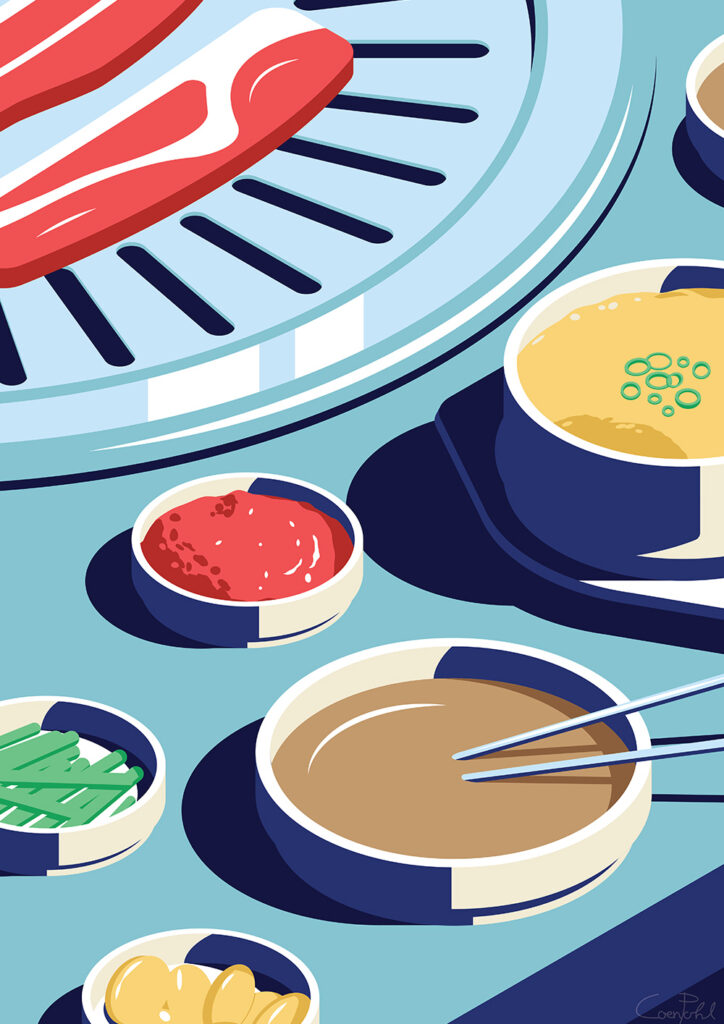 This is one the first illustrations in the iconic Night Life in Seoul series, where I got inspired to draw various night scenes I experienced in South Korea. All illustrations in this series are made in an close-up isometric perspective, making it more graphical and geometrical rather than realistic.
