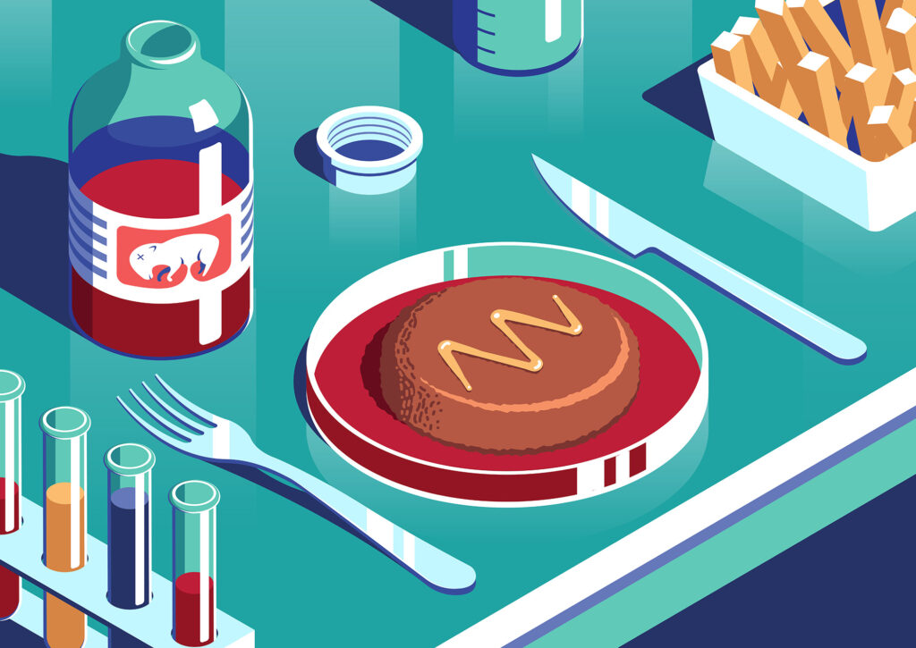 Illustration for an article about lab meat. Even though lab grown meat has a promising future, current methods still rely on foetus blood.